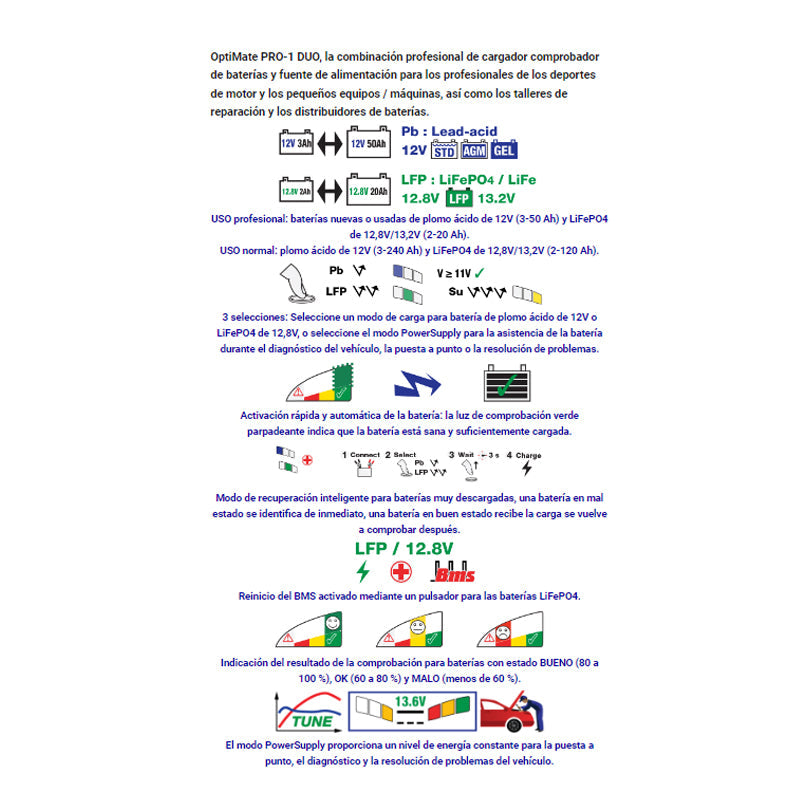 Ideal para: uso profesional baterías de plomo ácido de 12V STD y AGM desde 3-50 Ah, baterías de litio LFP (LiFePO4) de 12,8V/13,2V desde 2-20Ah.