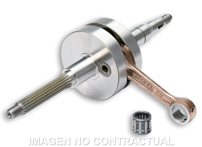 - Biela forjada en 18 Ni Cr Mo 5 con baño de cobre, acoplada al cigüeñal con jaula de agujas de precisión para alta velocidad